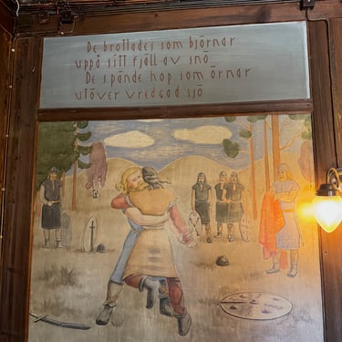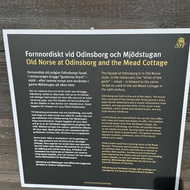 Just by the mounds stands Odinsborg — a restaurant and mead house whose facade is inscribed with Old Norse text. The tradition of serving mead (mjöd) here follows the same recipe used in the old Mead Cottage in Uppsala in the 19th century. It's a place to sit with coffee or something stronger and let the afternoon slow down. After walking the mounds, you'll want somewhere to land — and this is it.