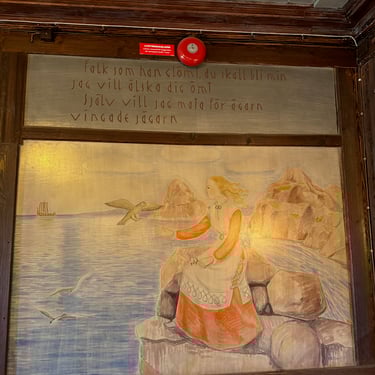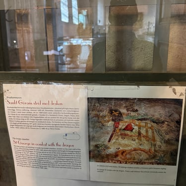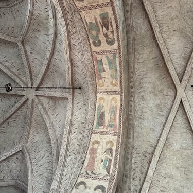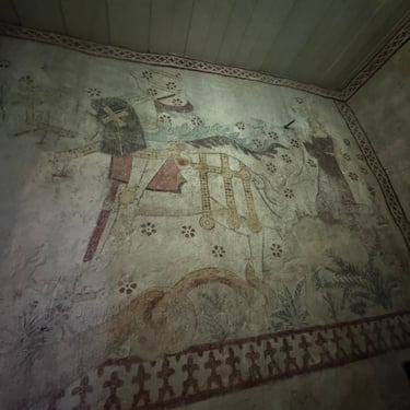 Along the walls, further medieval paintings depict scenes that blend Christian iconography with something older and harder to name. Photographing them in the warm, low light of the wall lamps, they feel less like decoration and more like memory.