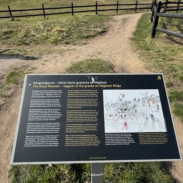 Several of the site's information panels deal directly with Old Norse mythology — Yggdrasil, Freya, and Odin — not as abstract stories but as beliefs that shaped what happened at this very site. The panels illustrate these connections thoughtfully, with artwork depicting the mythological world alongside the archaeological record. Standing at the mounds and reading these panels, the distance between myth and place collapses in a way that's genuinely unexpected.