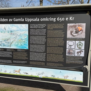 One of the most striking panels on site shows a scholarly reconstruction of what Gamla Uppsala looked like around 650 AD — a complex of halls, mounds, and open ceremonial space that makes clear this was no village. It was a capital.